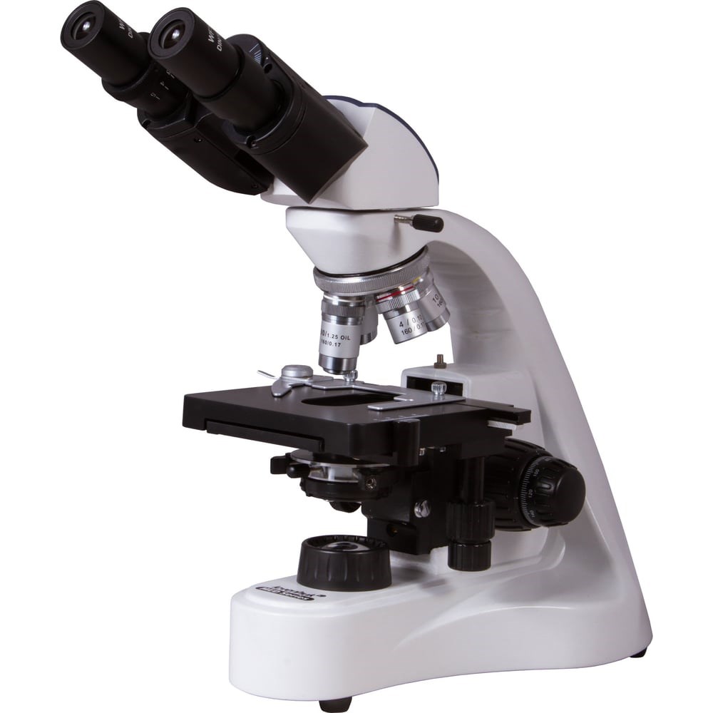 Бинокулярный микроскоп Levenhuk MED 10B предназначен для профессиональных исследований микропрепаратов на увеличении от 40 до 1000 крат с использованием метода светлого поля и масляной иммерсии. Он снабжен ахроматической оптикой, передает картинку высокого качества и может использоваться для работы в разных областях науки. Ахроматические микроскопы всегда востребованы у специалистов, поэтому этот микроскоп станет отличным помощником на кафедре высшего учебного заведения, в медицинской или клинико-диагностической лаборатории, в научно-исследовательском центре. Используйте ахроматы – микроскопы Levenhuk MED 10B с профессиональной оптикой. Бинокулярная насадка имеет наклон в 30°, поэтому микроскоп удобно использовать для длительных исследований образцов. Насадка вращается на 360°, при необходимости ее можно развернуть в любую сторону. Ахроматическая оптика имеет антигрибковое покрытие. В комплект поставки включены два широкопольных окуляра с диоптрийной коррекцией и четыре ахроматических объектива с разным увеличением. Ахроматический объектив микроскопа – это значительное увеличение детализации и четкости передаваемого изображения. Пружинящие оправы есть у двух объективов – 40-кратного и 100-кратного. 100-кратный объектив можно использовать для наблюдений с применением масляной иммерсии (флакон с маслом в комплекте). Настроить резкость можно при помощи ручек грубой и точной фокусировки. Двухкоординатный предметный столик снабжен препаратоводителем. Яркая светодиодная подсветка работает от сети переменного тока, есть регулировка яркости. Для более точной настройки освещения используется конденсор Аббе с ирисовой диафрагмой. В специальный держатель можно устанавливать светофильтры.