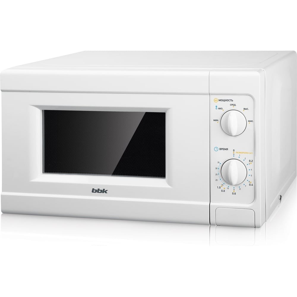 Микроволновая печь BBK 20MWS-705M/W белый 00-00000599 обладает простым управлением: регулятор мощности, регулятор времени и клавиша открытия двери. Регулятор мощности имеет 5 положений, которые соответствуют 5 возможным уровням мощности микроволнового излучения. Уровень НИЗ наиболее оптимален для разморозки и отмечен специальным значком. Таймер времени рассчитан на 35 минут. Выбрать правильное время для разморозки того или иного количества продуктов поможет нанесенная вокруг регулятора времени шкала веса. Объем камеры - 20 литров, мощность микроволн - 700 Вт.