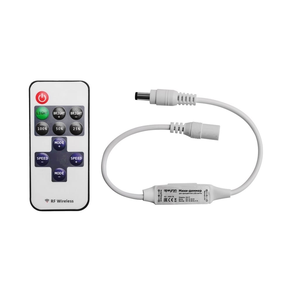 Мини-диммер предназначен для управления монохромной светодиодной лентой 12/24 В. С помощью него можно включать или выключать светодиодную ленту, отрегулировать ее яркость, а также использовать различные динамические режимы и отрегулировать скорость их работы. Прибор может работать как от напряжения 12 В, так и 24 В. Важно отметить, что в зависимости от того с каким напряжением предстоит работать устройству, будет отличаться и максимальная мощность нагрузки, которую можно подключить к нему. Так, при напряжении 12 В максимальная нагрузка будет равна 72 Вт, а при напряжении 24 В уже 144 Вт. Дистанционный пульт управления передает сигнал по радиоканалу, благодаря чему сам прибор можно убрать из зоны видимости без потери сигнала от пульта. Управление осуществляется с помощью кнопок, расположенных на лицевой стороне пульта, который работает от 1-й батарейки CR2025.Накладной корпус, выполненный из пластика , благодаря миниатюрному размеру 40х12х5 мм, позволяет разместить его даже в профиле для светодиодной ленты. Степень защиты от пыли и влаги соответствует стандарту IP20, что подразумевает установку устройства в сухом, проветриваемом помещении.Количество кнопок на пульте - 11;Связь пульт/контроллер - RF-радио;Ток нагрузки - 6 А.