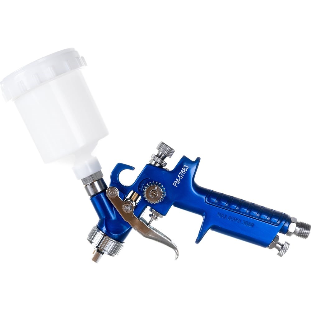 Краскопульт системы HVLP c верхним бачком. Предназначен для окраски небольших поверхностей лакокрасочными материалами, в том числе для технологии "быстрого ремонта". Может применяться для нанесения красок на водной основе. Небольшие размеры и легкий вес. Дюза и игла сделаны из нержавеющей стали, корпус анодирован. Регулировка подачи воздуха находится в нижней части ручки пистолета. Давление: 3 бар (PSI) Расход воздуха: 100 л/мин Объем бачка: 125мл