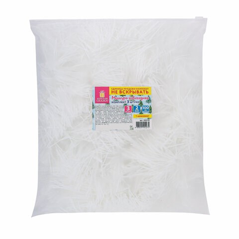 Длина мишуры в расправленном виде составляет 2 м, диаметр – 10 см. Материал мишуры – полиэтилентерефталат. В комплекте – 3 штуки мишуры белого цвета. Упакованы в пакет с зиплоком.