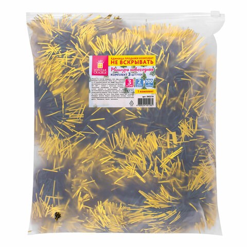 Длина мишуры в расправленном виде составляет 2 м, диаметр – 10 см. Материал мишуры – полиэтилентерефталат. В комплекте – 5 штук зелёной мишуры с золотистыми кончиками. Упакованы в пакет с зиплоком.