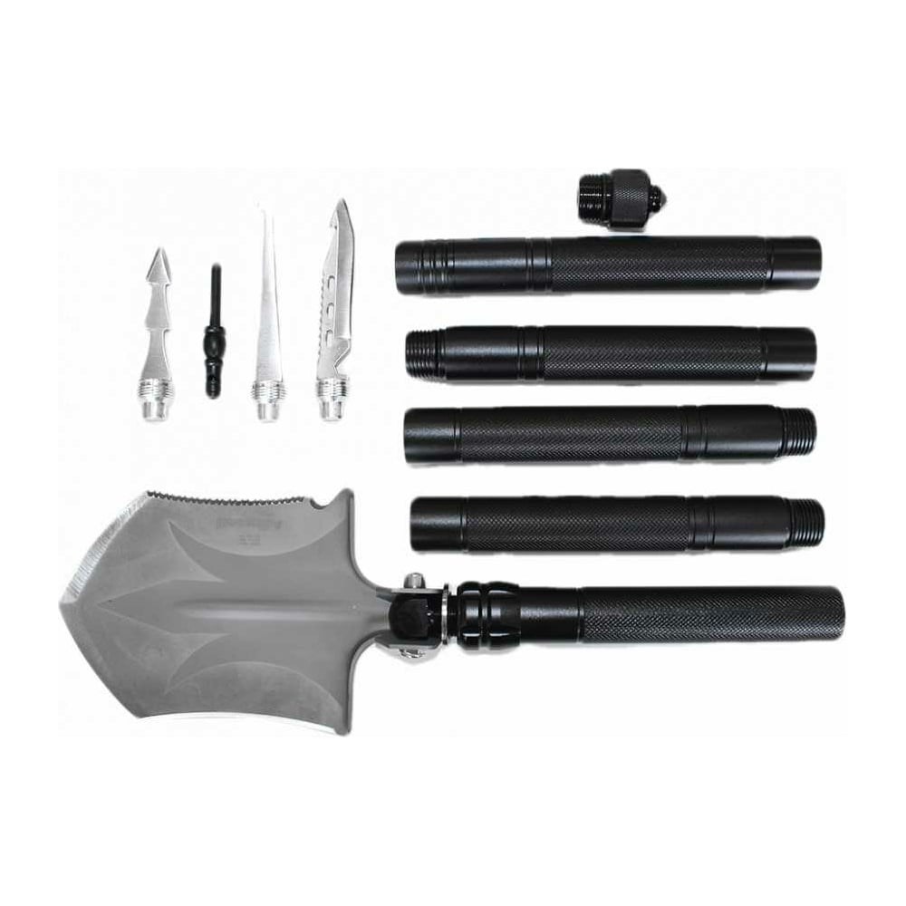Модель Adimanti HK002 – многофункциональное изделие, которое совмещает ряд инструментов, необходимых для выживания в полевых условиях. Изделие изготовлено из облегченных материалов, которые не утяжеляют вес туристического снаряжения, и имеет долгий срок службы, чтобы служить пользователю множество сезонов.Полотно лопаты Adimanti HK002 изготовлено из стали 2Cr13. Этот сплав маловосприимчив к механическим повреждениям. Во избежание скола или загиба кромки, рекомендуем точить не часто и без сильного давления на инструмент. Полотно имеет оптимальные габариты для решения различных задач на природе: длина составляет 12.2 сантиметра, а ширина – 16.5 сантиметров. Толщина стального полотна составляет 5 миллиметров.Черенок лопаты складывается из четырех удлинителей, которые соединяются между собой при помощи резьбы с крупным шагом. У пользователя есть возможность самостоятельно выбирать длину черенка, используя несколько или сразу все удлинители. Полная длина черенка со всеми составляющими равна 118 сантиметрам. Удлинители изготовлены из алюминиевого сплава, который встречается в большинстве походных инструментов бренда. Несмотря на ультралегкий вес, алюминий обладает повышенной износостойкостью, за счет чего материал выдерживает повышенные нагрузки без деформирования. Сплав также характеризуется невосприимчивостью к воздействию влаги, кислот и солей, благодаря чему материалу не страшна ржавчина и он надолго сохраняет первоначальный внешний вид.