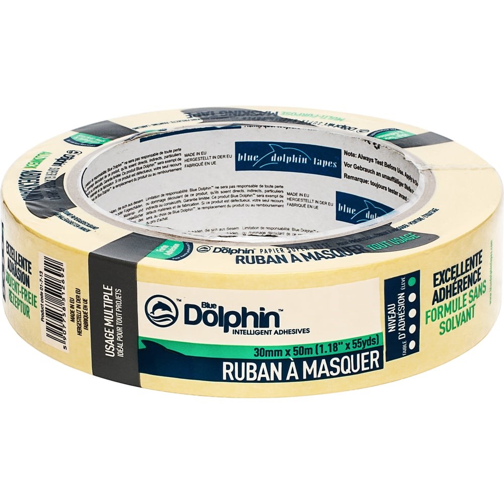 Многофункциональная малярная лента Blue Dolphin Masking Tape желтая 30мм х 50м 01-7-13 ST627 применяется для защиты поверхностей при проведении малярных, штукатурных и других работ внутри помещений, а также для упаковки и крепления. Особенности: Ровный окрасочный край без подтёков Клей не содержит растворителей Высокая адгезия Супергладкая бумага 3-дневное чистое удаление без следов клея