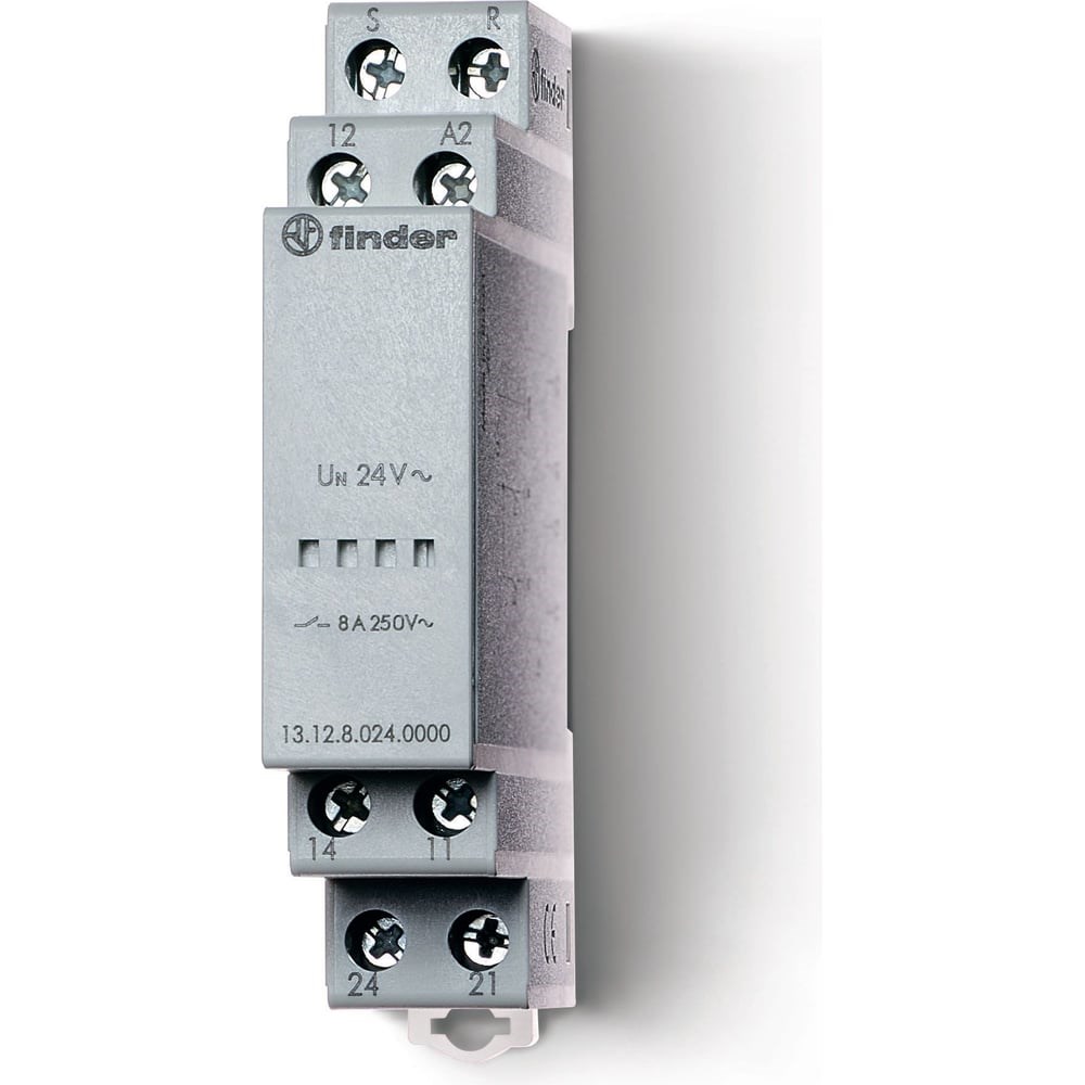 Дополнительные характеристики модульного электронного импульсного реле Finder со сбросом, 1 CO + 1но конт. 8а, = 24в A, 131200240000: Вызывные реле с возвратом подходят для жилых и коммерческих помещений: душевые, больница, отель. Установка на рейку или монтажный фланец (EN 60715). Материал контактов - AgCdO. Номинальное напряжение катушки - 24 В.