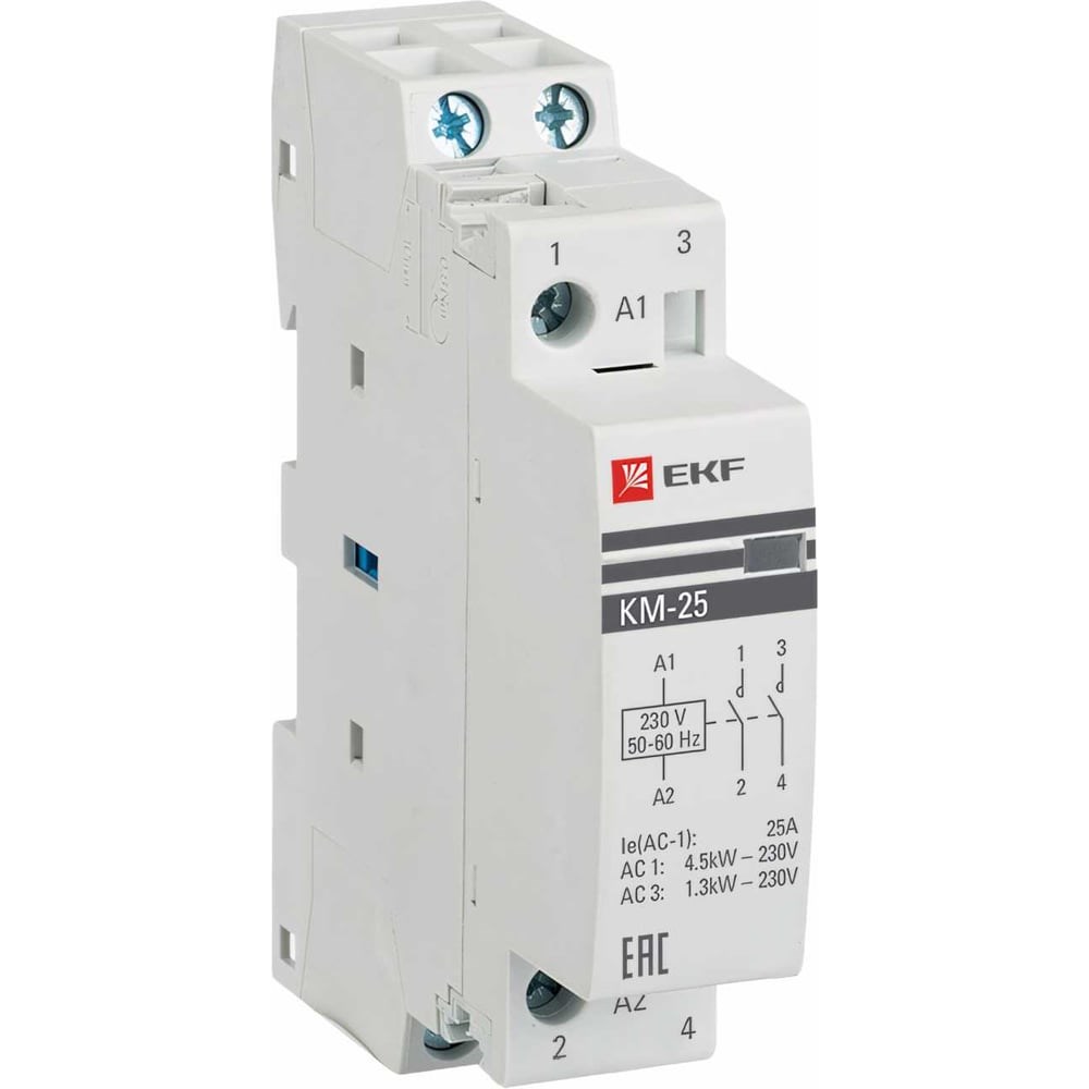 Модульный контактор EKF КМ 25А 2NО (1 мод.) PROxima km-1-25-20 состоит из неподвижных контактов, подвижных контактов, которые закреплены в подвижной части магнитной системы. Неподвижная часть магнитной системы закреплена жестко в корпусе КМ. Пружина препятствует смыканию контактов. При подаче напряжения на катушку управления в магнитной системе контактора возникает магнитное поле, которое, преодолевая сопротивление пружины, смыкает магнитную систему и замыкает контакты. При отключении напряжения с катушки управления пружина размыкает контакты. Дополнительные характеристики: Номинальное импульсное напряжение Uimp, 6кВ. Номинальный условный ток короткого замыкания, 3 кА. Диапазон напряжения замыкания контактов, В От 195 до 253. Диапазон напряжения размыкания контактов, От 46 до 172В. Скорость срабатывания при замыкании, 20 мс. Скорость срабатывания при размыкании, 30 мс. Потребляемая мощность катушки управления, не более, 5 Вт. Напряжение катушки управления, Uс, 230 B (AC). Механическая износостойкость 1 000 000, коммутационных циклов. Электрическая износостойкость, 150 000 коммутационных циклов. Высота над уровнем моря, не более, 2000 м. Исполнение: Стационарное. Рабочее положение в пространстве: Вертикальное. Группа механического исполнения по ГОСТ 17516.1: М3.