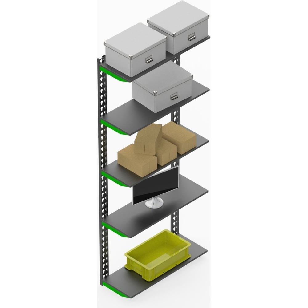 Модульный стеллаж ООО Металекс Metalex серии FLY 2000x1000x300, 5 полок SMFV20010030 используется для хранения вещей и документов в офисах, на производстве, на складах, в магазинах, в доме, на балконах, на дачах и других помещениях. Распределенная нагрузка на полку до 25 кг, распределенная нагрузка на стеллаж до 125 кг. Данный стеллаж поставляется с металлическими полками толщиной 0,8 мм, которые имеют дополнительные ребра жесткости. Стойки и кронштейны выполнены из 1,5 миллиметровой стали. Безболтовое соединение обеспечит легкую и быструю сборку. Полки можно выставлять на любом удобном уровне. В комплект входит набор креплений к стене, крепление кронштейнов происходит с помощью зацепов. Цвет: тёмно - серый + зелёный.