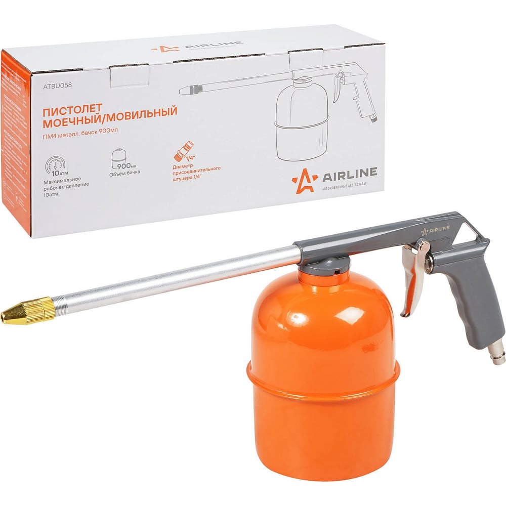 Пистолет моечный/мовильный ПМ4 металл. бачок 900мл AIRLINE ATBU058 изготовлен из металла. Имеет съёмный бачок для распыляемого состава. Прочный металлический корпус устойчив к повреждениям