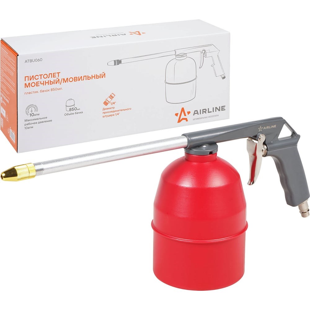 Пистолет моечный/мовильный пластик. бачок 850мл. AIRLINE ATBU060 изготовлен из металла. Имеет съёмный пластиковый бачок для распыляемого состава. Прочный металлический корпус устойчив к повреждениям.