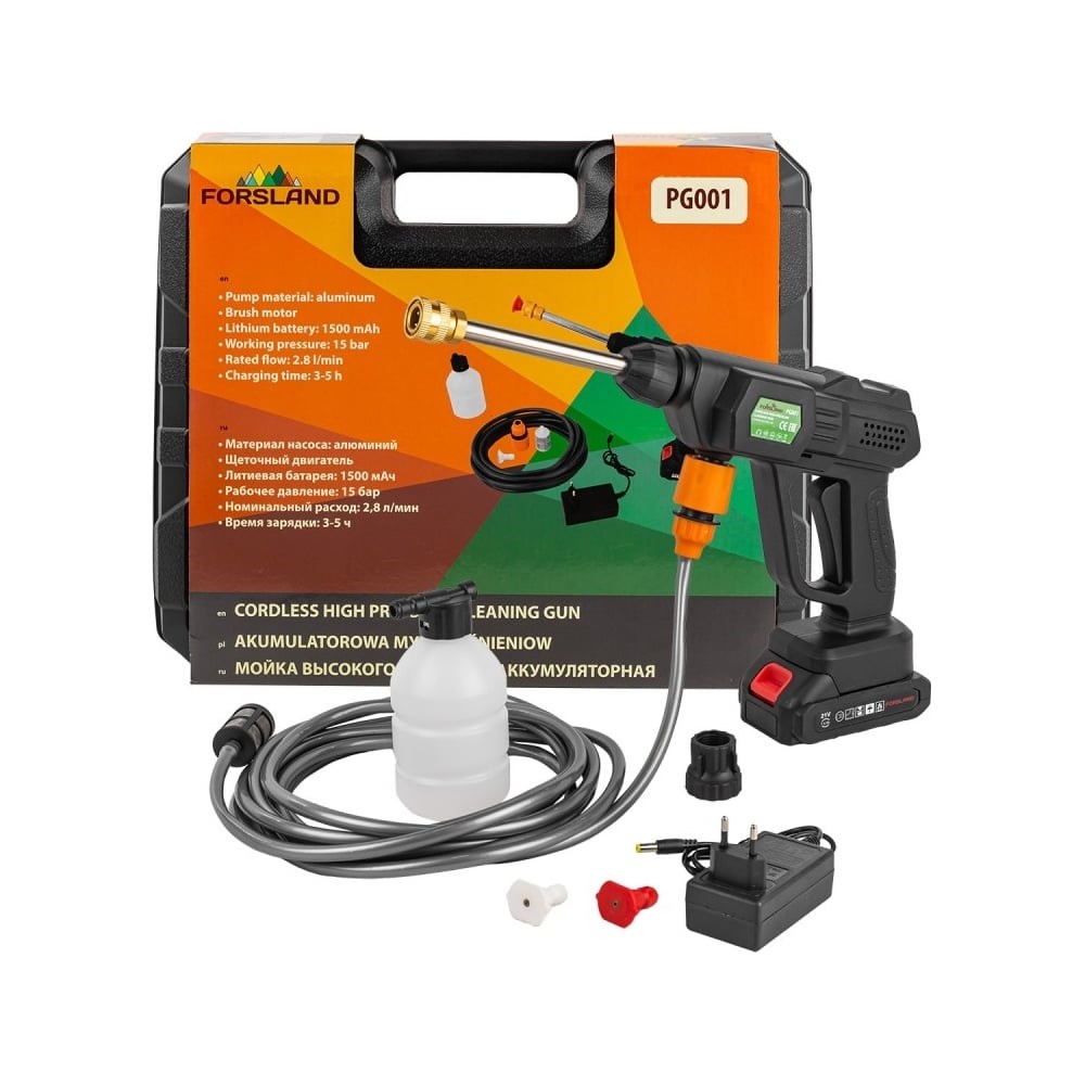 Мойка высокого давления аккумуляторная FORSLAND - это универсальный помощник для гаража, дома, дачи. Комплектация данной модели состоит из 3 видов насадок, что позволит легко справиться с любым видом загрязнения. Идеально подойдет для мойки автомобиля, мотоцикла или велосипеда. Кроме того, пистолет аккумуляторный можно использовать не только для мытья, но и для полива садовых растений. Для этого следует установить на копьё рассеивающую насадку, которая обеспечит распыление воды широким факелом как из душа, и отрегулировать напор. Для мойки авто и твердых поверхностей подойдет спринклер высокого давления. А пеногенератор поможет быстро нанести моющее средство на загрязнённый предмет или поверхность. Ее щеточный двигатель обеспечивает эффективную и мощную подачу воды под давлением. Литиевая батарея емкостью 1500 мАч обеспечивает достаточное время работы без подзарядки. Система подачи воды обеспечивает рабочее давление до 15 бар, что позволяет успешно справляться с загрязнениями на различных поверхностях. Номинальный расход воды составляет 2,8 литра в минуту, что дает оптимальное соотношение расхода воды к производительности. Время зарядки аккумулятора составляет 3-5 часа. Корпус мойки высокого давления выполнен из прочного пластикового материала, который обеспечивает стойкость к механическим воздействиям и защиту от возможного удара. Весь набор поставляется в надежном пластиковом кейсе где у каждого инструмента и аксессуара есть свое место.