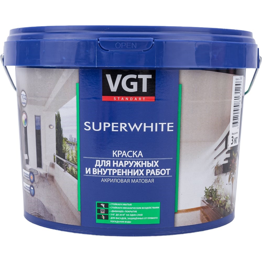 Моющаяся краска для наружных и внутренних работ VGT Супербелая ВД АК 1180