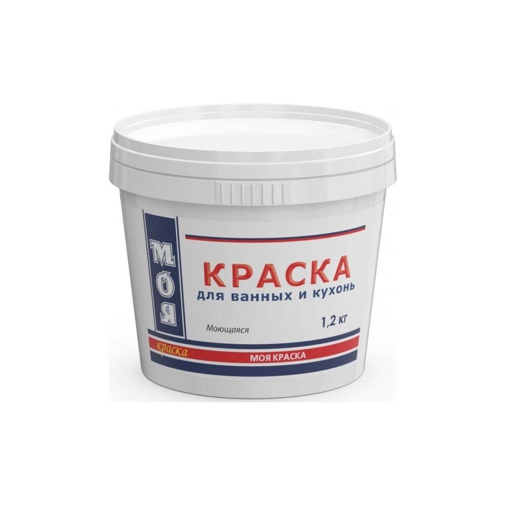 Моющаяся краска для ванных и кухонь МОЯ КРАСКА водно-дисперсионная, 1.2 кг 16463 - это водоэмульсионная краска для внутренних работ. Краска для стен моющаяся подходит для ремонтных работ внутри помещений с повышенной влажностью, таких как ванная и кухня. Благодаря содержанию в составе мелкоизмельченной мраморной крошки, краска для стен, потолка образует белоснежное матовое покрытие, которое со временем не желтеет. Краска моющаяся влагостойкая, устойчива к влажной уборке с применением неабразивных бытовых моющих средств. Окрашенные поверхности Вы легко сможете очистить при помощи влажной губки. Водоэмульсионка практически не имеет запаха, таким образом делает ремонт в жилых помещениях комфортным. Тем более, что краска для ванной комнаты имеет высокую укрывистость, легко наносится и быстро высыхает. В отличие от меловой краски краска моющаяся не мелит, то есть не пачкает одежду и мебель при соприкосновении. Поэтому в/д краску выбирают для окрашивания обоев. Акриловая краска белая широко применяется на различных поверхностях, её можно использовать как краску для дерева, краску по бетону, по кирпичу, как краску по камню, гипсокартону, также подходит как краска для стен и потолков, краска для обоев. Краска моющаяся для кухонь и ванн образует экологичное покрытие. При необходимости сменить цвет, краску для стен можно обновить, не снимая предыдущий слой.