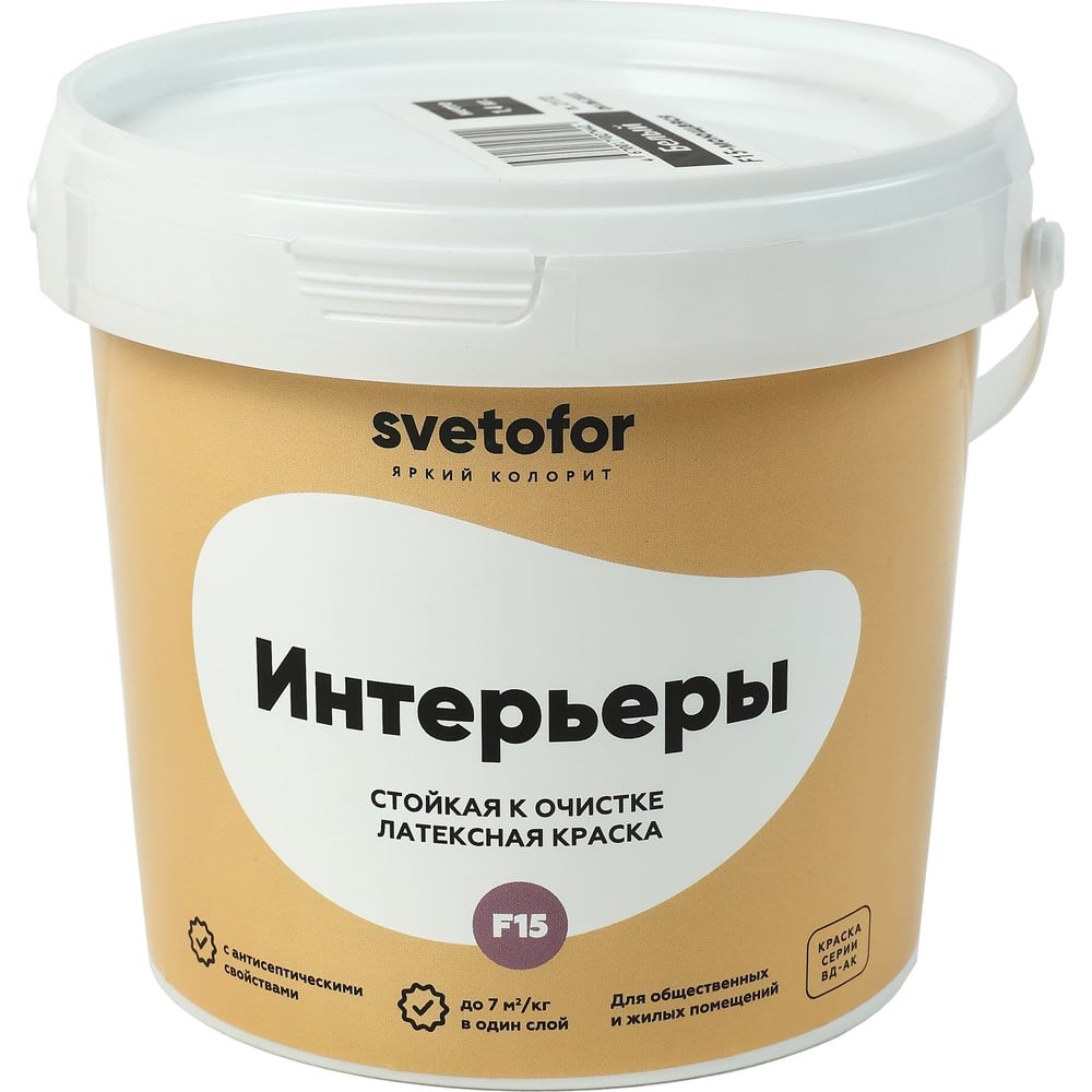 Краска Светофор F15 моющаяся, Супербелая 1,4 кг ЗОР00007300 служит для окрашивания поверхностей, которые часто подвергаются влажной уборке. Используется на деревянных, бетонных, каменных и кирпичных основаниях, а также может наноситься на обои под покраску. В составе продукта отсутствуют токсичные и горючие вещества. После высыхания образуется шелковисто-матовое покрытие, устойчивое к износу и истиранию.