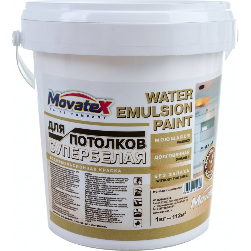 Водоэмульсионная краска для потолков Movatex супербелая, моющаяся, 1 кг Т02321 предназначена для декоративного окрашивания пористых оснований (дерево, кирпич, бетон, штукатурка). Состав практически не имеет запаха, легко наносится и быстро сохнет, образуя однородное "дышащее" покрытие. Продукт отличается хорошей укрывистостью, высокой белизной и устойчивостью к мытью.