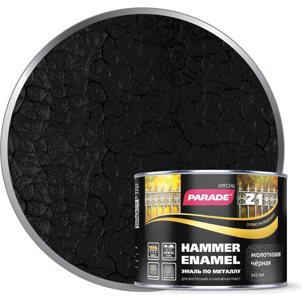 Эмаль по металлу PARADE Z1 молотковая 543-504 черный 0,45 л Лк-00002089 - преобразователь ржавчины, антикоррозионный грунт и износостойкий финишный слой. Для внутренних и наружных работ. Для окраски металлических поверхностей: забор, ворота, решетки и т.п., а также деревянных поверхностей для создания «металлического» эффекта.
