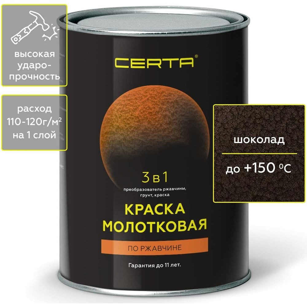 Краска образует рисунчатые и рельефные покрытия, одновременно маскирует небольшие дефекты металлической поверхности. Возможно нанесение по ржавчине. Предназначена для защитно-декоративной отделки металлических изделий, мебели, кованых изделий, для окрашивания приборов и механизмов, спецтехники, эксплуатируемых в условиях повышенной влажности и температур до +150°С. Характеристики Антикоррозийность. Универсальная защита бетона и металла. Стойкость к перепадам температур от −30 до +150 °С. Отличное сцепление с окрашиваемой поверхностью изделий сложной конфигурации. Прогнозируемый срок службы покрытия — свыше 11 лет. Срок годности — 12 месяцев. Способ применения (основные правила для успешной окраски): Подготовка поверхности: очистить от загрязнений, обезжирить растворителем CERTA или ксилол (недопустимо использовать уайт-спирит, сольвент, бензин). Подготовка эмали: тщательно перемешать, при необходимости разбавить растворителем (сольвентом) до 10% от общей массы. Грунтовочный слой: допускается нанесение без предварительного грунтования. Способ нанесения: кисть, валик, краскопульт. Нанесение: наносить не менее чем в 2 слоя с толщиной покрытия 150-200 мкм. Промежуточная сушка: 120 минут при +20 °С. Полное высыхание: 24 часа. Хранение: хранить в плотно закрытой таре в сухом помещении, предохраняемом от прямого воздействия солнечных лучей и влаги, при температуре от −30 °С до +40 °С. Беречь от огня