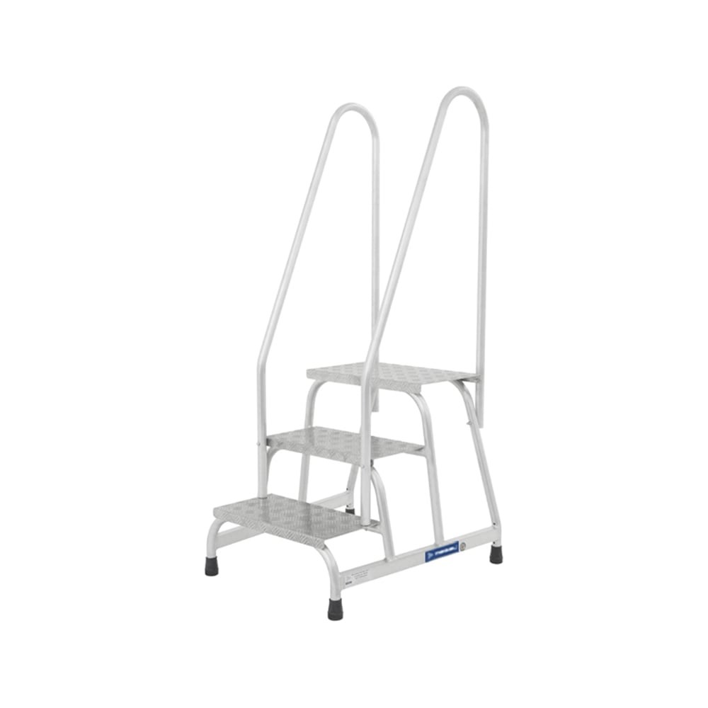 Монтажная подставка с двумя поручнями MEGAL тип 1, 3 ступени 050403 применяется для работы на небольшой высоте. Изготовлена из алюминия, который отличается прочностью, небольшим весом и устойчивостью к воздействию коррозии. Безопасность. Предусмотрены широкие ступени с рифленым покрытием и два поручня для безопасного подъема и спуска. Резиновые башмаки на ножках гарантируют устойчивость подставки.