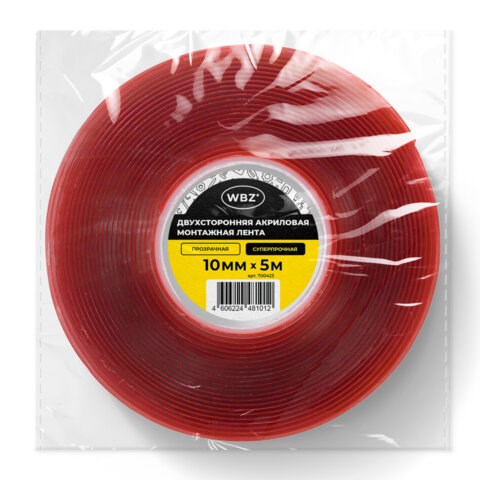 Монтажная прозрачная суперпрочная двухсторонняя лента 10 мм х 5 м, акриловая, толщина 1 мм, WBZ (ВБЗ), 700423