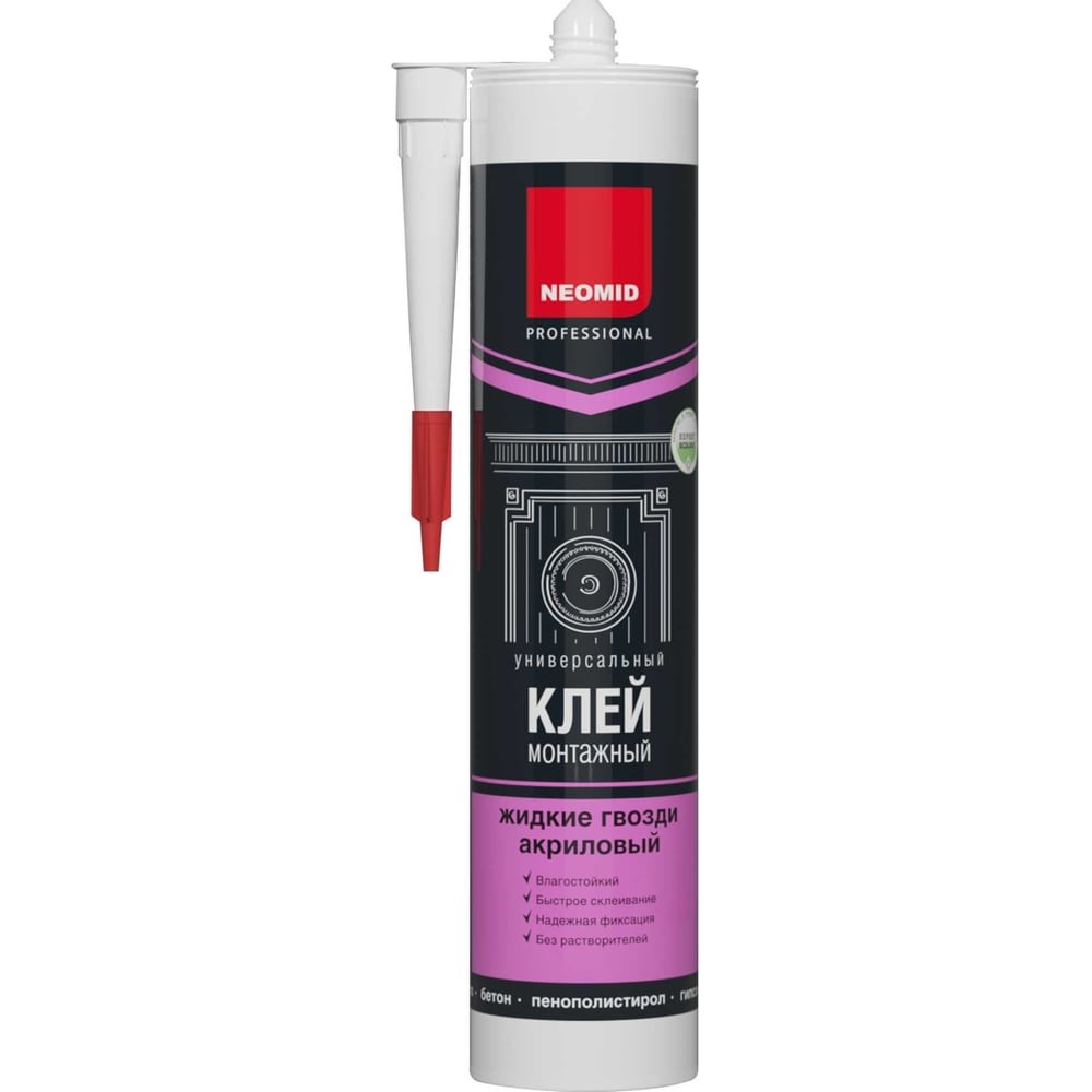 Неомид Клей монтажный акриловый “Жидкие гвозди” (310 мл) картридж (БЕСЦВЕТНЫЙ) для внутренних и наружных работ предназначен для приклеивания изделий к минеральным и деревянным основаниям. Может использоваться в качестве шпатлевки для заделки дефектов или стыков поверхностей, выравнивания неровностей, заделки трещин, устранения прочих поверхностных дефектов.