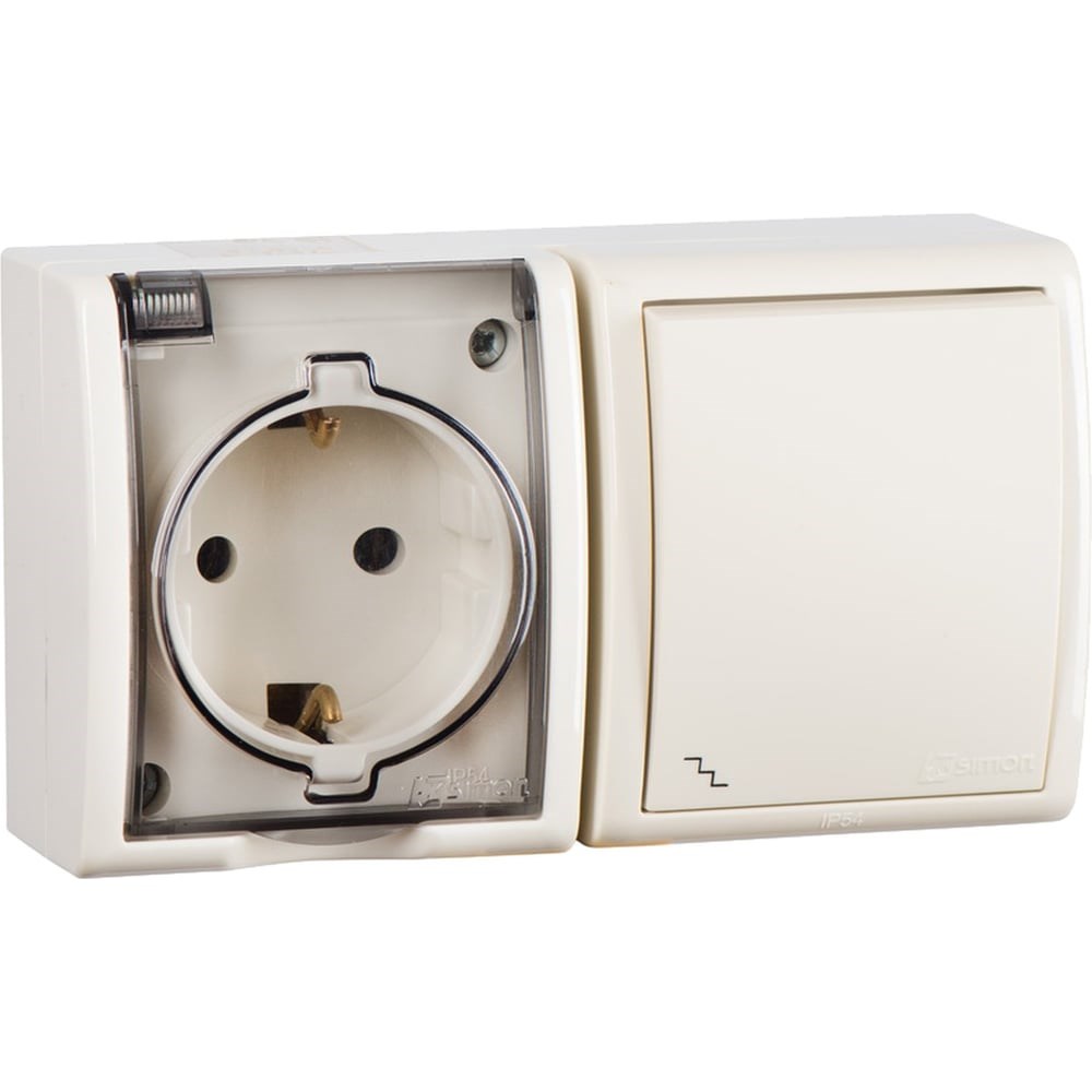 Блок розетка с заземлением + выключатель 1 клавишный проходной Simon Schuko 16А 250В 10А 250В, IP54, S1 1594516-031