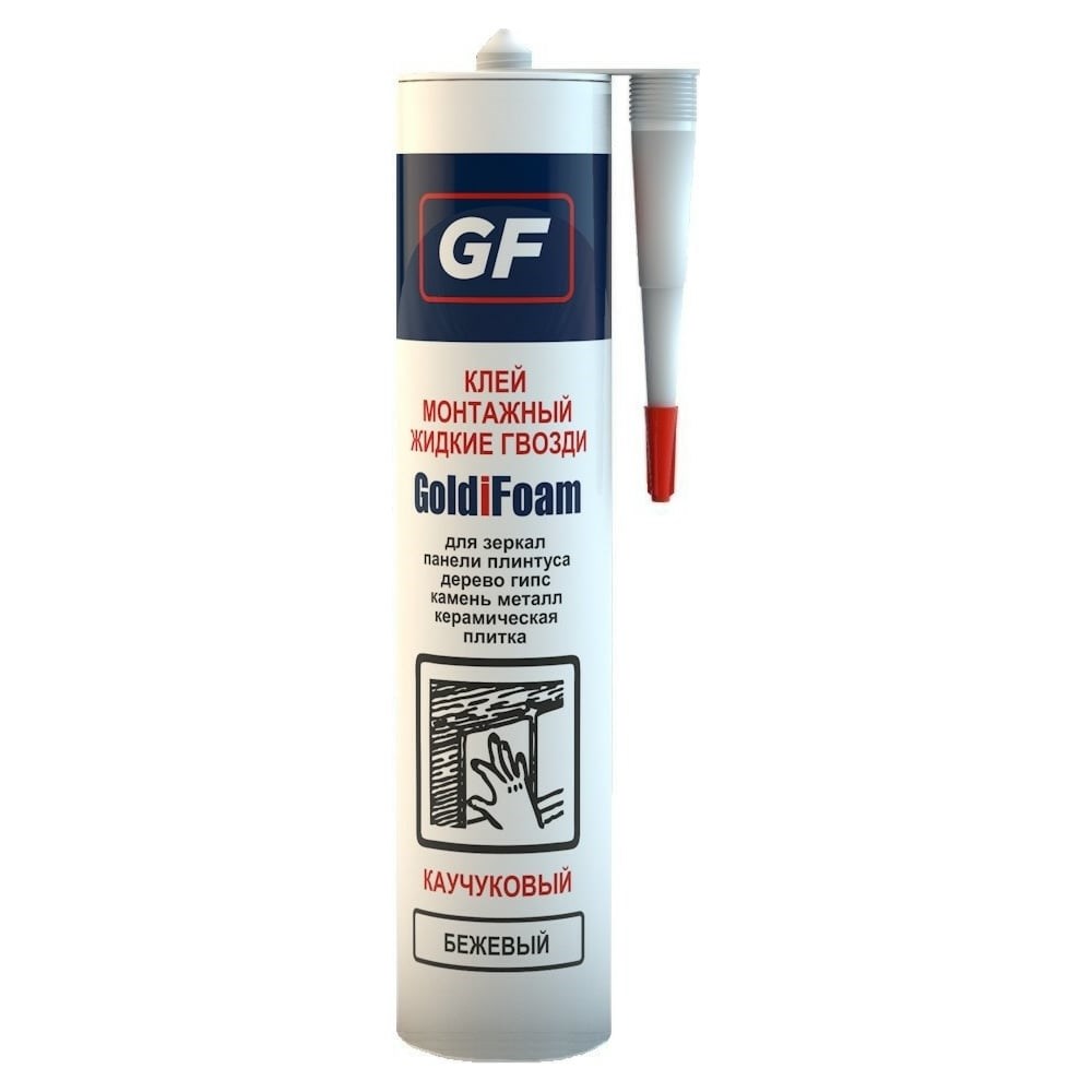 Монтажный клей для зеркал GoldiFoam GF бежевый, 260 мл 393260001 - это однокомпонентный клей в виде пасты на основе синтетических каучуков в органических растворителях. Клей предназначен для приклеивания зеркал. Применение: приклеивания зеркал к стенам, к типичным поверхностям, таким как бетон, штукатурка, древесно-стружечная плита, дерево, гипс, кирпич, склеивание декоративных элементов из дерева, гипса, корка, древесно-стружечных плит, металла, камня, пенополистирола, плинтусов, панелей, плит и керамической плитки. Свойства: быстрое и очень сильное начальное схватывание, эластичный шов, устойчив к влажности, отличная адгезия.