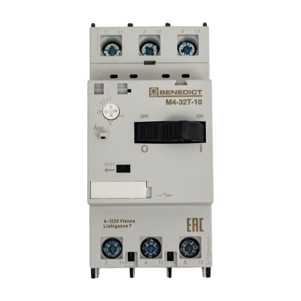 Мотор-автомат Benedict M4-32T-10 PN73060 предназначен, в первую очередь, для пуска, остановки и защиты однофазных и трехфазных асинхронных двигателей. Номинальный ток 10А.