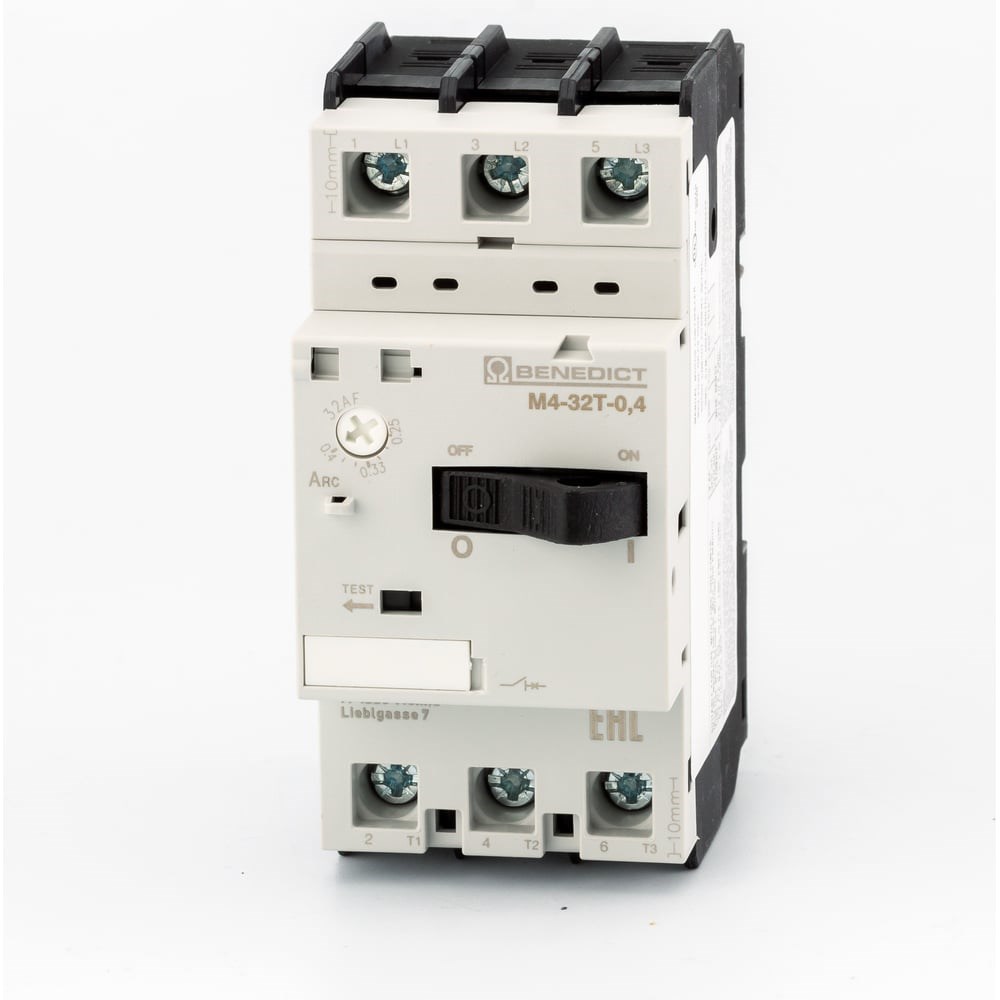 Мотор-автомат Benedict M4-32T-0,4 (PN73056) предназначен для пуска, остановки и защиты однофазных и трехфазных асинхронных двигателей. Основные характеристики: Тип переключателя: кнопочный Номинальный ток: 0.4А Мощность двигателя: 0.09кВт Диапазон уставок тока срабатывания теплового реле: 0.25-0.4А Ток мгновенного расцепителя: 5.2А Перегрузочная способность при 3~400В: 100кА Монтаж: DIN-рейка