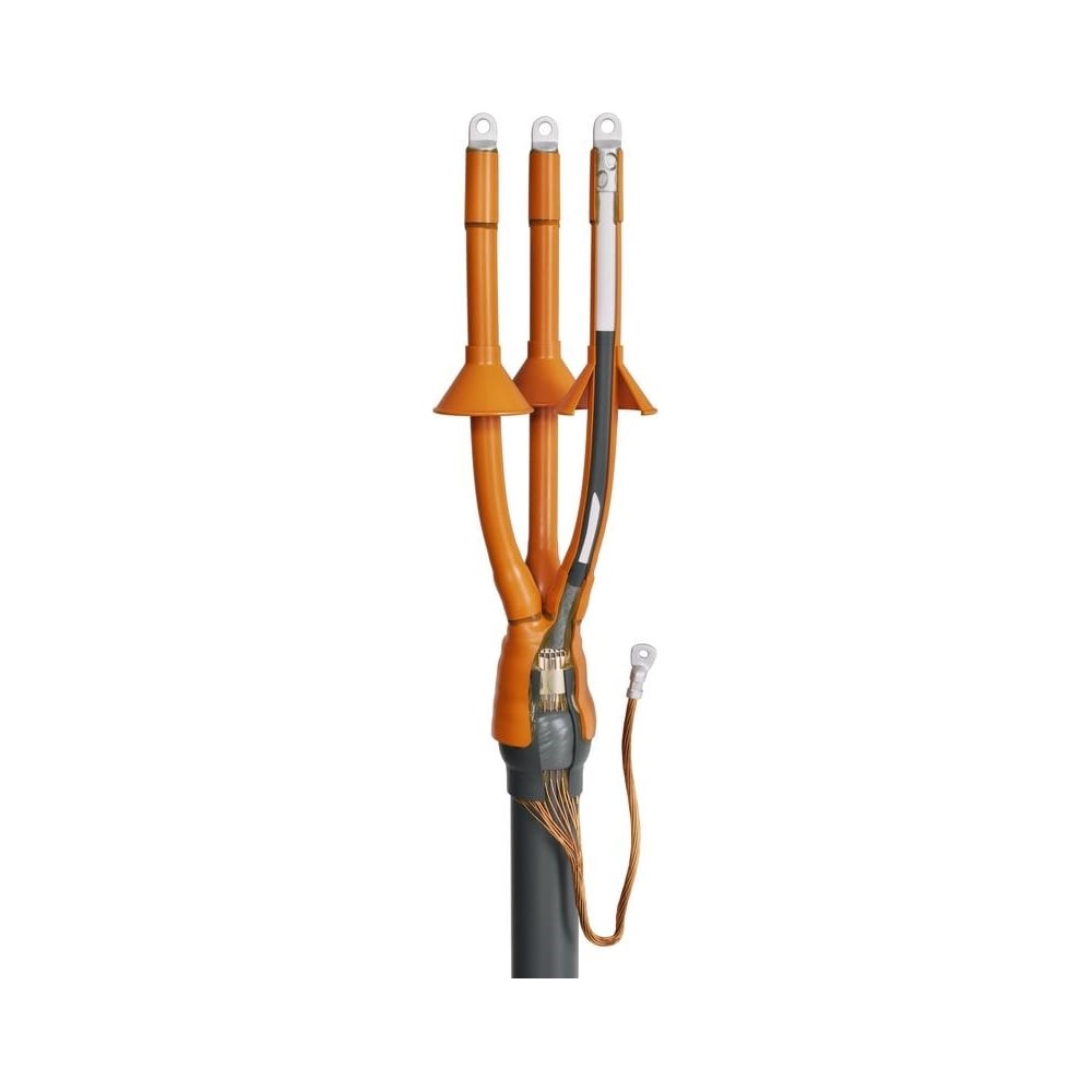 Предназначены для оконцевания 3-х жильных кабелей с этиленпропиленовой резиновой изоляцией и экраном из медных проволок на напряжение 6 и 10 кВ Типы кабелей: РЭБВнг(А)-LS, АРЭБВнг(А)-LS, РЭВГнг(А), АРЭВГнг(А)-LS, РЭБРнг(А)-LS, АРЭБРнг(А)-LS, РЭПГнг(А)-LS, АРЭПГнг(А)-LS Наличие трубок выравнивания напряженности электрического поля обеспечивает надежность функционирования муфт за счет равномерного распределения напряженности электрического поля на срезах полупроводящих экранов жил кабеля Материал изолирующей трубки и изоляторов кирпично-красного цвета устойчив к явлению трекинга, воздействию ультрафиолетовых лучей и погодно-климатическим условиям Муфты наружной установки оснащены антитрекинговыми жильными изоляторами, увеличивающими длину путей токов утечки и создающими сухие зоны на поверхности муфты Термоплавкий клей, нанесенный на внутреннюю поверхность термоусаживаемой перчатки и антитрекинговых трубок, обеспечивает полную герметичность муфты Провод заземления формируется непосредственно из проволочного экрана кабеля и оконцовывается наконечником под опрессовку В стандартную комплектацию муфты входит пружина постоянного давления для присоединения провода заземления к бронелентам При монтаже узла заземления на кабель с броней из стальных или алюминиевых проволок необходимо дополнительно использовать «Комплект заземления КМПБ» Комплект муфты универсален и позволяет использовать как кабельные наконечники под опрессовку, так и болтовые наконечники Выпускается по ТУ 3599-005-97284872-2015