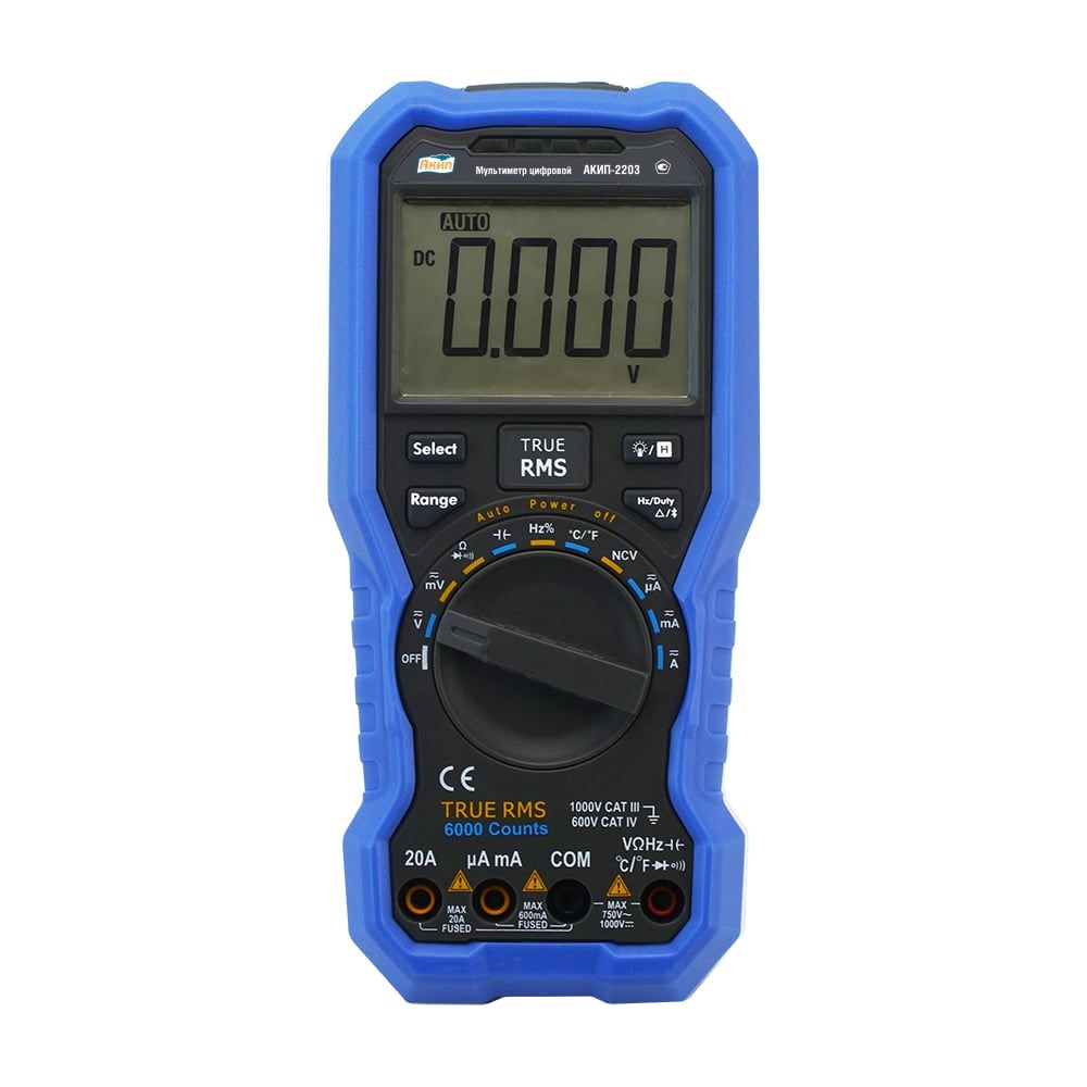 Цифровой мультиметр АКИП-2203/1 Измерение переменного до 750 В и постоянного напряжения до 1000 В, переменного и постоянного тока до 20 А, частоты, скважности (%), емкости, сопротивления и целостности цепи (прозвонка со звуковой и световой сигнализацией), температуры, испытание p-n переходов. Базовая погрешность (DCV): 0,5%, Максимальное разрешение: 10 мкВ/ 0,1 мкА/ 0,1 Ом/ 1мГц/ 10пФ/ 1 °С Измерение ср. кв. значения сигналов произвольной формы (TRMS) Бесконтактный детектор напряжения: Non-Contact Voltage (NCV) ЖК-индикатор (5999), 3 изм/с, подсветка дисплея Удержание показаний (HOLD, относительные измерения (∆) Батарейное питание, индикация состояния источника питания Автовыключение: 30 мин (спящий режим) Пыле-, влагозащищенность, компактность, безопасность Габариты 190 х 83 х 56 мм без защитного хольстера С защитным хольстером 196х89х56 мм Материал – пластик.