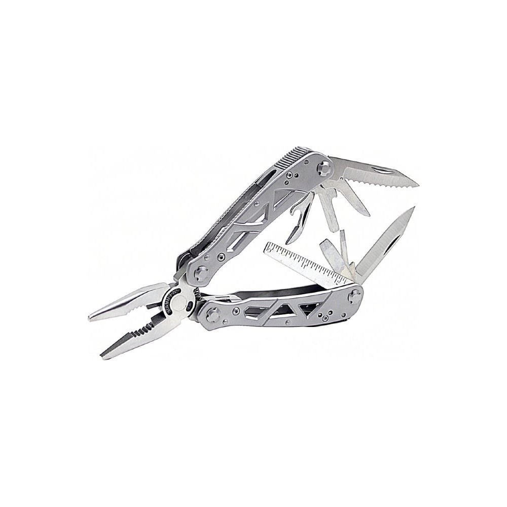 ФункцииПлоскогубцы,кусачки,нож с прямой кромкой,нож с серрейторной кромкой,шило,линейка,открывалка для банок и бутылок, одна крестовидная отвертка,две плоских отвертки, 9 сменных насадок,переходник для насадок.