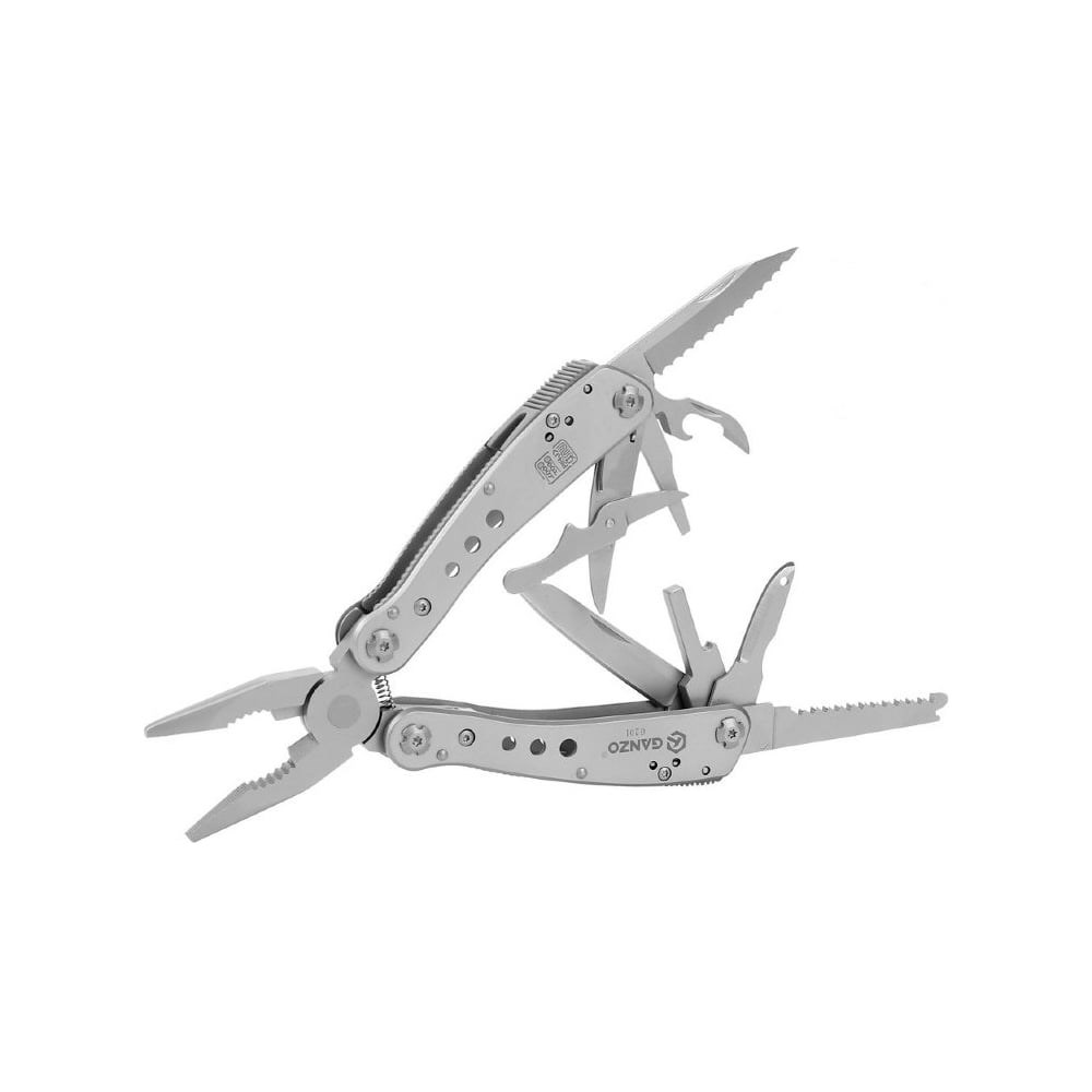 Мультитул Ganzo G201 представляет из себя практичный инструмент для ремонта любого снаряжения или даже техники в походных условиях. Он довольно компактный и легкий (265 грамм), чтобы его было удобно брать с собою в поездки. В то же время, Ganzo G201 успешно справляется с 22 различными функциями. Главный инструмент в данной модели — плоскогубцы с кусачками и держателем круглых предметов. Остальные элементы представляют собою компактные инструменты, размещенные внутри рукояток, наподобие швейцарского ножа. Это ножи с гладкой и серрейторной заточкой, пила, открывалка для консервов, ножницы, шило, две небольшие плоские отвертки. Помимо того, большой набор сменных наконечников для отвертки вынесен в отдельный органайзер. Они закрепляются на держателе мультитула при помощи магнитного переходника. Все инструменты мультитула изготовлены из стали хорошего качества — марка 440С. Этот сплав не ржавеет и хорошо защищен от многих других видов коррозии. Потому, мультитул хорошо зарекомендовал себя в качестве инструмента для полевого использования. Особенности: полноразмерные плоскогубцы комплект из 22 инструментов мультитул изготовлен из стали 440С большой набор сменных бит удобный чехол для хранения имеются обычный и серрейторный ножи