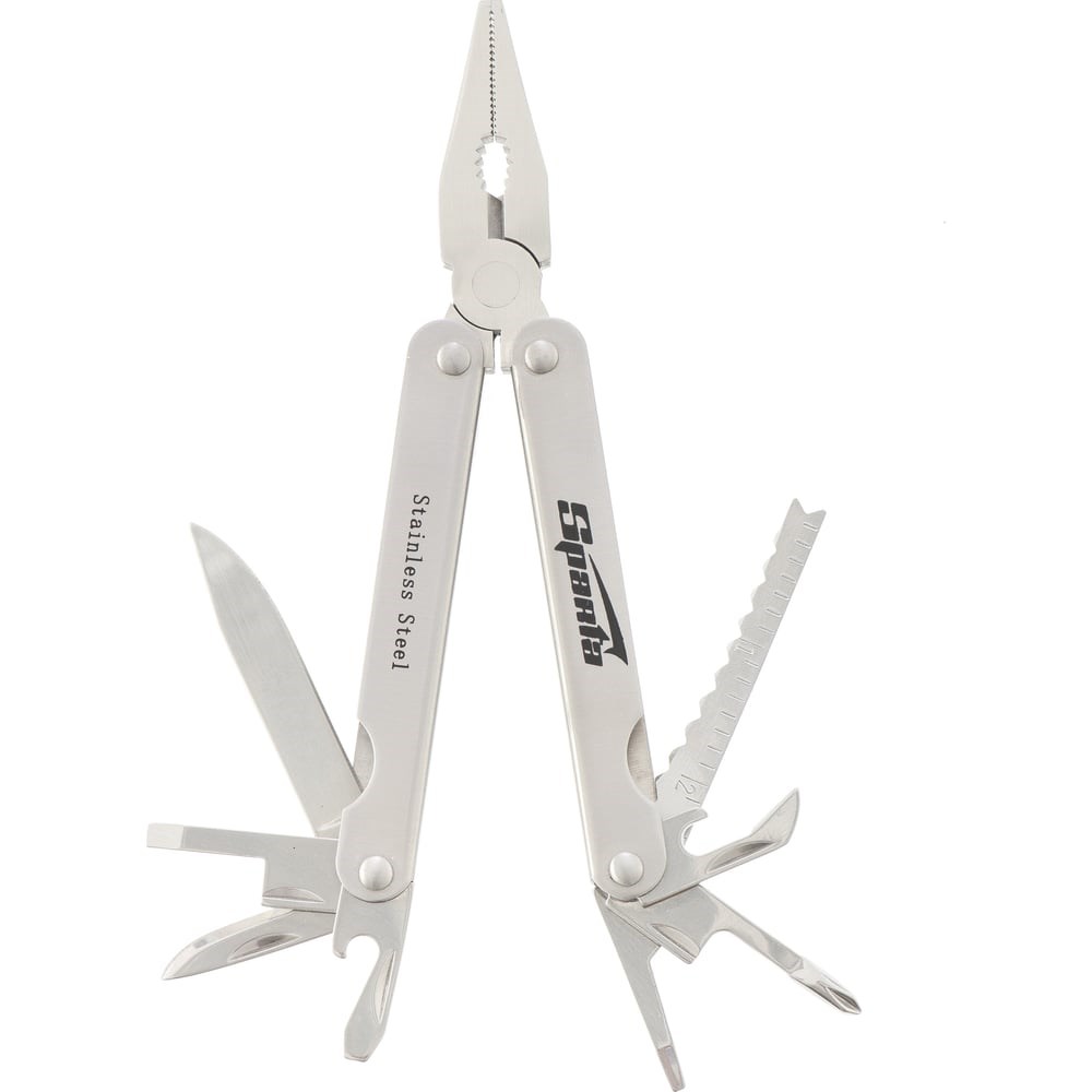 Функцииплоскогубцы, длинногубцы, кусачки, захват круглых предметов, нож для чистки рыбы, линейка, шило, консервный нож, открывалка для бутылок, крестовая отвертка, малая и большая шлицевые отвертки, малый и большой ножи