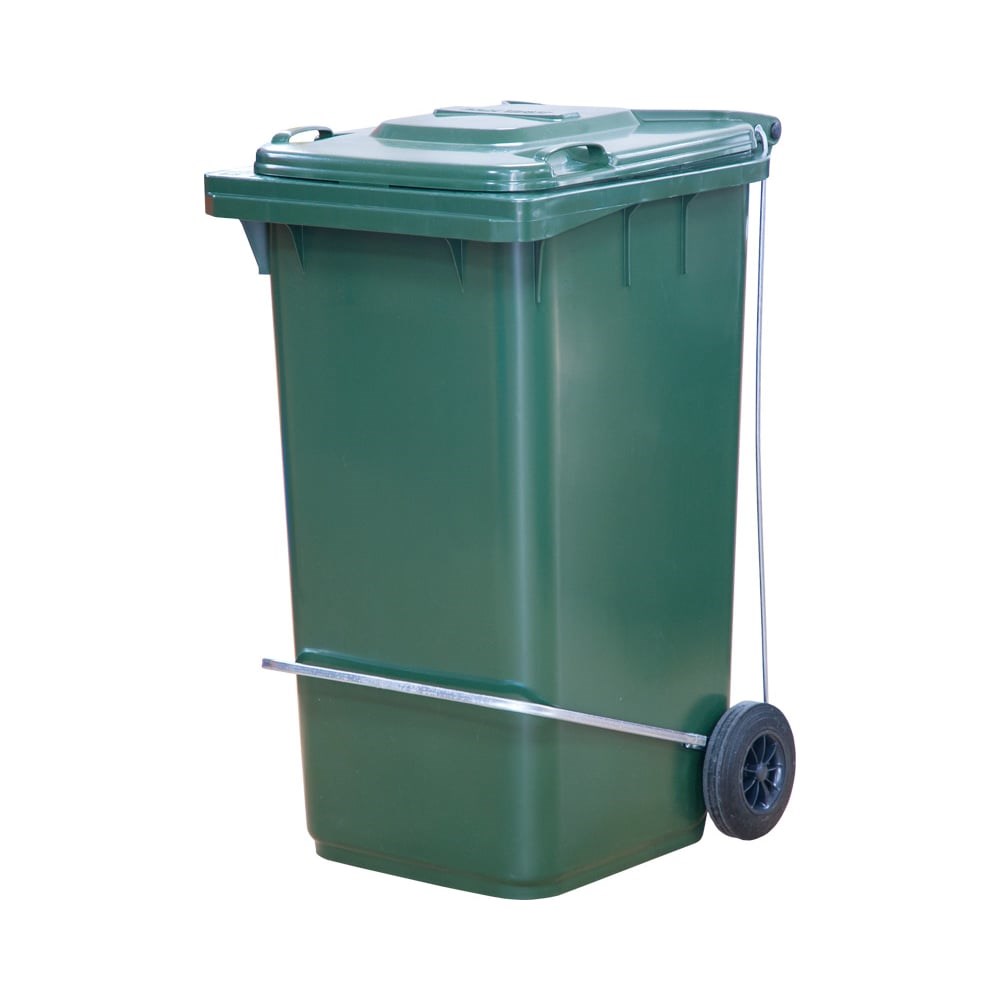 Мусорный контейнер Тара.ру п/э 240 л с педальным приводом П-образным, зелёный 17721 - контейнер для сбора твердых бытовых отходов, изготовлен из полиэтилена низкого давления, оборудован колесами для удобства перемещения. Бак имеет плотно закрывающуюся крышку, предотвращающую распространение неприятных запахов.