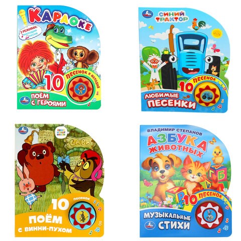 Ребёнок с удовольствием будет листать плотные картонные страницы, рассматривать красочные картинки, нажимать на кнопку и слушать весёлые и мелодичные песенки, подпевая героям любимых мультфильмов.