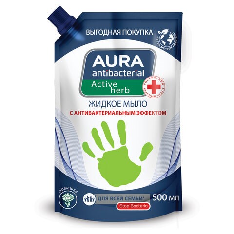 Мыло жидкое антибактериальное для всей семьи 500 мл, AURA АНТИБАКТЕРИАЛЬНАЯ "Ромашка", дой-пак, 10510