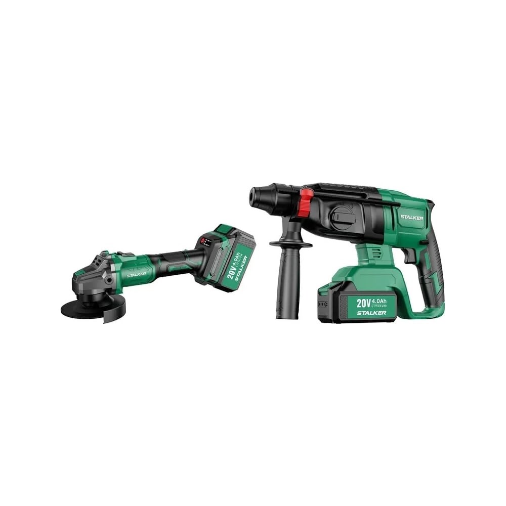 Бесщеточный аккумуляторный перфоратор STALKER RH20 Li BL- предназначен для сверления отверстий в различных материалах: дерево, сталь, бетон, кирпич и т.д. Имеет 3 режима работы: сверление, сверление с ударом, долбление + предустановка долота. Мощный бесщеточный двигатель обеспечивает высокую производительность и долгий срок службы. Светодиодная подсветка позволяет использовать инструмент в темных помещениях, обеспечивая хороший обзор места сверления.Характеристики:Напряжение аккумулятора: 20 ВЕмкость аккумулятора: 4 АчТип двигателя: бесщеточныйМакс. количество оборотов: 1400 об/минМакс. диаметр сверления буром (бетон): 20 ммБесщеточная аккумуляторная угловая шлифмашина STALKER AG20-125 Li BL- применяется для шлифования и резки металла, камня. Мощный бесщеточный двигатель обеспечивает высокую производительность и долгий срок службы. Рукоять с резиновым покрытием Softgrip обеспечивает комфортную работу пользователя и не скользит в руке.Характеристики:Напряжение аккумулятора: 20 ВЕмкость аккумулятора: 4 АчТип двигателя: бесщеточныйДиаметр диска: 125 ммМакс. количество оборотов: 8500 об/мин