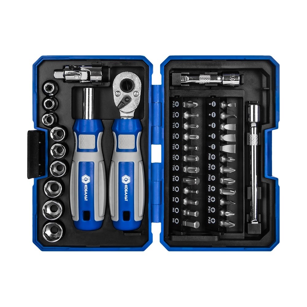 Набор бит и головок с трещоткой предназначен для работ с различным типом крепежа. Отверточная рукоятка в наборе предназначена для работы с битами, которые надёжно фиксируются в рукоятке благодаря встроенному в неё магниту. Трещоточная рукоятка в наборе позволяет работать как с головками, так и с битами без использования переходника. Все изделия в составе набора выполнены из хром-ванадиевой стали. Кейс выполнен из пластика с вставками из резины.