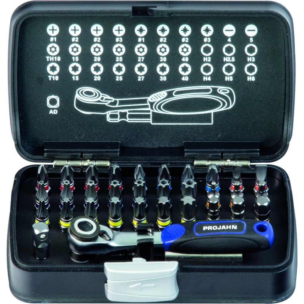 Набор бит с трещоткой PROJAHN 4095 1/4 COLOR 33 пр., в кейсе 4095 представлен в оптимальной комплектации и содержит в себе самые популярные типоразмеры бит. Привлекательный и компактный дизайн кейса Удобный замок кейса, дающий возможность пользоваться набором одной рукой Каждый тип бит имеет уникальную цветовую разметку Высококачественная мини-трещетка позволяет работать с усилием до 70Нм