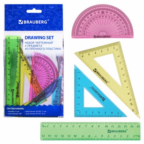 Набор чертежный малый BRAUBERG "Crystal" (линейка 15 см, 2 угольника, транспортир), цветной, 210295