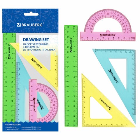 Набор чертежный средний BRAUBERG "Crystal" (линейка 20 см, 2 угольника, транспортир), цветной, 210296