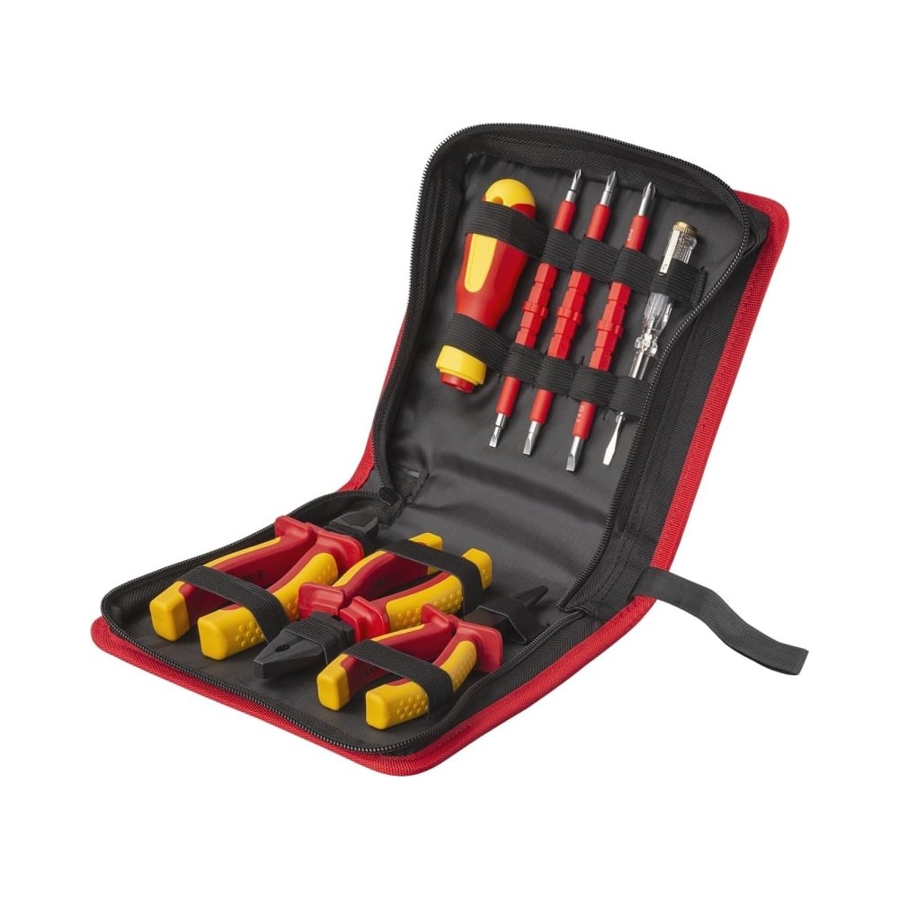 Набор диэлектрических инструментов Онлайт Монтаж OHT-Ind04-H10 предназначен для выполнения электромонтажных и слесарных работ в установках с напряжением не более 1000 В.Рабочие части губцевых инструментов изготовлены из высококачественной углеродистой стали марки 55 и тщательно отполированы. Многокомпонентные рукоятки с упорами обеспечивают крепкий хват, предотвращая проскальзывание руки. Рабочие части инструментов подвергнуты индукционному закаливанию токами высокой частоты, что значительно продлевает их ресурс. Инструменты имеют никелевое покрытие для защиты от коррозии. Сменные двусторонние стержни отверток выполнены из хром-ванадиевой стали, закалены, покрыты изоляционной оболочкой, наконечники намагничены.Компактный прочный тканевый кофр обеспечивает безопасное хранение и транспортировку инструмента.Набор состоит из следующих инструментов: отвертка «6в1» с набором бит SL4, SL5, SL6, PH0, PH1, PH2, пассатижи 160 мм, бокорезы 160 мм, длинногубцы 160 мм, Отвертка-индикатор 100–500 В, 140 мм.Такой набор инструментов может использовать дома или в профессиональной деятельности электрика, монтажника, мастера, он послужит идеальным подарком мужчине на 23 февраля, новый год, день рождения или любой другой личный или профессиональный праздник.