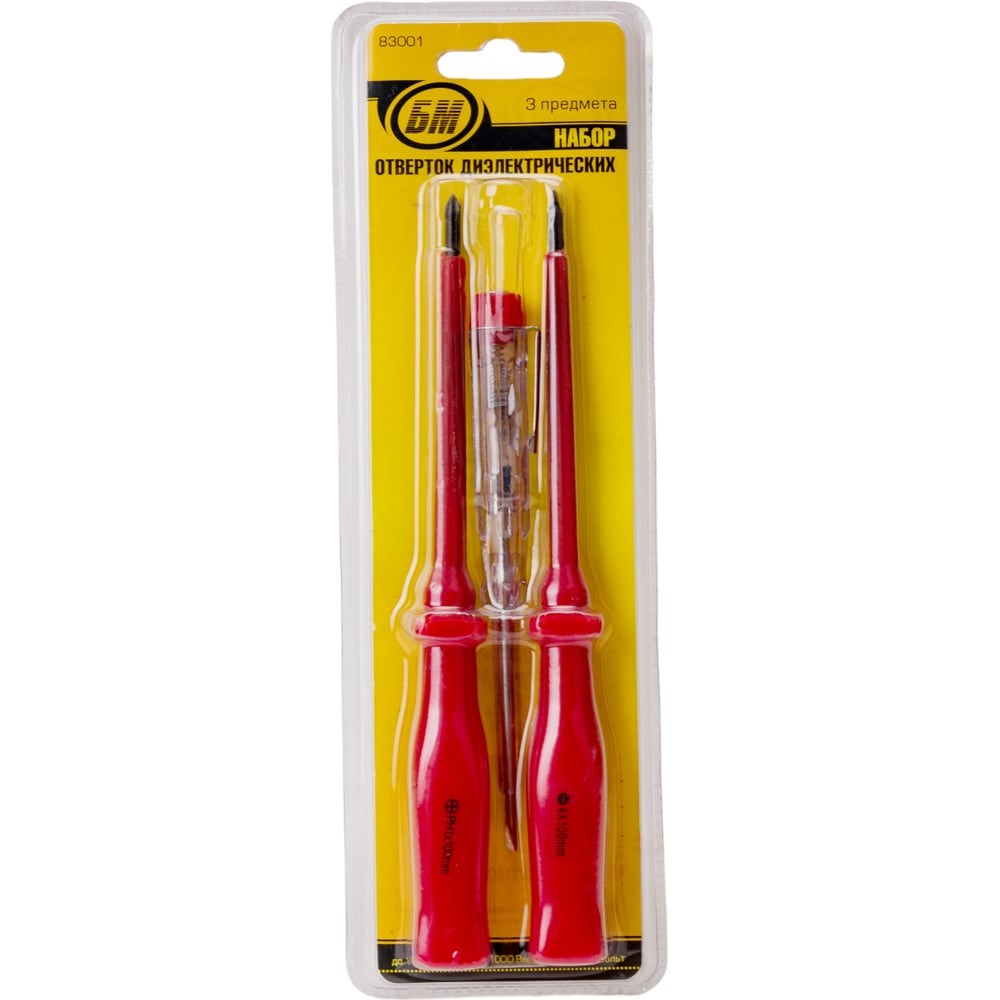 Набор диэлектрических отверток БМ 140 мм, SL4x100, PH1x100, 3 предмета, пробник 83001 представляет собой профессиональный инструмент. Отвертки имеют эргономическую двухкомпонентную рукоятку и изоляционное покрытие стержня. Материал стержня - CrV. Наконечники намагничены. Набор диэлектрических отверток предназначен для монтажа и демонтажа резьбовых соединений, находящихся под напряжением.