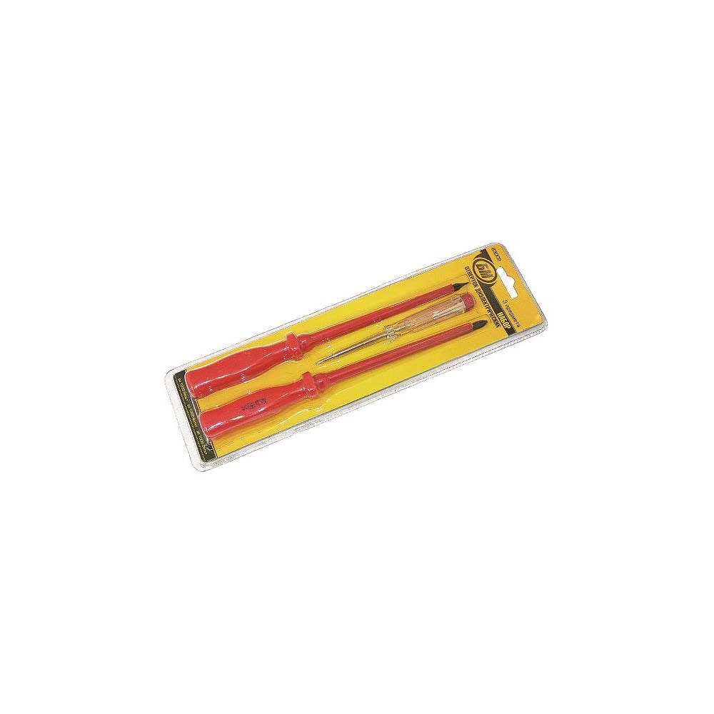 Набор диэлектрических отверток БМ пробник 140 мм, SL6x150, PH2x150 3 предмета 83002 предназначен для монтажа и демонтажа резьбовых соединений, находящихся под напряжением до 1000В. Эргономическая двухкомпонентная рукоятка обеспечивает комфортную эксплуатацию. Индикатор напряжения (тестер) 120-250В в комплекте служит для обнаружения напряжения в сети. Отвертки имеют изоляционное покрытие стержня. Стержни отверток выполнены из качественной хромованадиевой стали, что обеспечивает прочность и долговечность. Наконечники отверток намагничены для удобного извлечения крепежа.