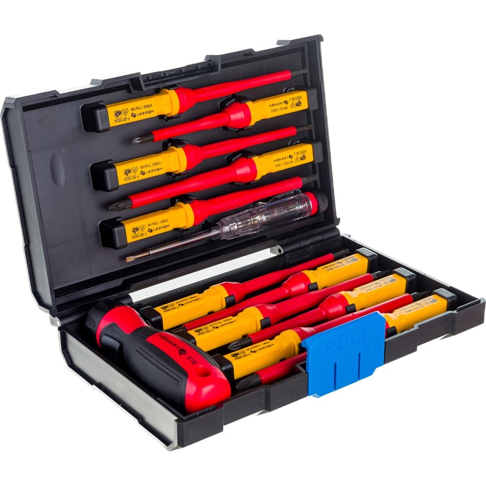 HOEGERT TECHNIK Набор диэлектрических отверток для точных работ 1000 V, сталь S2, 13 пр. HT1S997: Безопасность и точность при работе с электричеством! Набор диэлектрических отверток – это профессиональный комплект, предназначенный для безопасной и точной работы с электрическим оборудованием под напряжением до 1000 В. Набор включает в себя широкий спектр отверток различных типов и размеров, а также индикаторную отвертку для обнаружения напряжения.Преимущества:Безопасность: Соответствует нормам EN 60900 и имеет сертификат VDE 1000 VУниверсальность: Включает в себя 13 предметов, в том числе отвертки плоские, крестовые (Phillips и Pozidriv) и Torx, а также индикаторную отверткуВысокое качество: Изготовлен из высококачественной легированной стали S2, обеспечивающей долговечность, устойчивость к деформациям и повреждениямУдобство работы:Закаленный и отпескоструенный рабочий наконечник укрепляет жало и обеспечивает надежный захват крепежа.Изолированная и намагниченная насадка увеличивает точность и комфорт работыДвухкомпонентная рукоятка с профилированной противоскользящей поверхностьюИндикаторная отвертка в комплекте: В набор входит индикаторная отвертка для работы с напряжением AC 100-500 V, позволяющая безопасно проверять наличие напряжения в розетках и других электрических цепяхHOEGERT TECHNIK HT1S997 - это надежный, безопасный и универсальный набор, который станет незаменимым помощником для профессиональных электриков и тех, кто ценит безопасность при работе с электричеством!