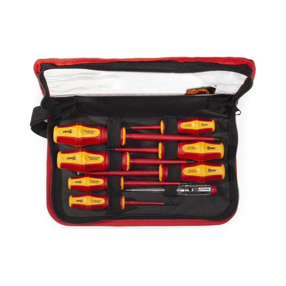 Набор диэлектрических отверток КВТ "Профи" НИО-08-S 87130 поставляется в прочном и удобном чехле на молнии. С его помощью можно безопасно переносить инструмент. Для удобства работы также имеется тестер в комплекте. Рукоятки не скользят. Также стержень прочно закреплен - можно вращать с большим усилием.
