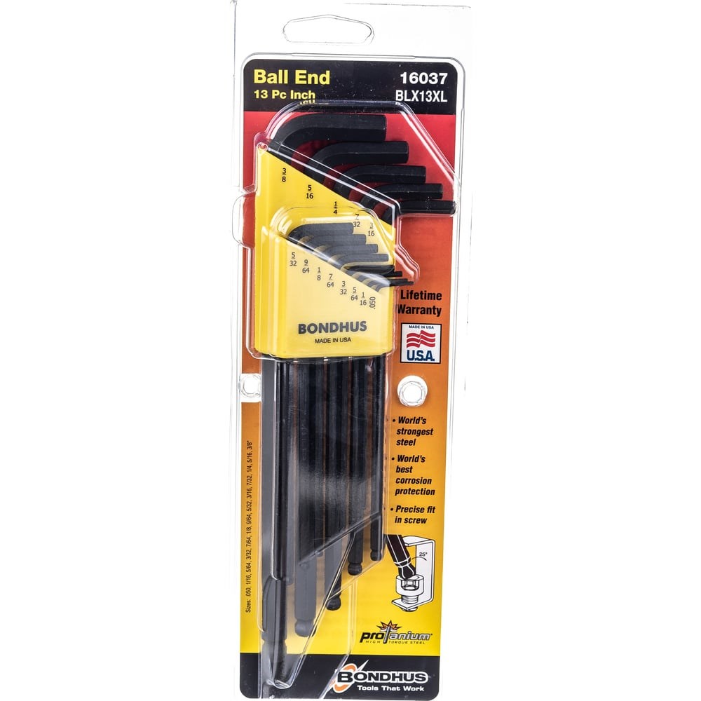 Набор из 13 дюймовых черных ключей с шариком BONDHUS XL .050-3/8"d 16037 подходит для работы с крепежом с внутренним шестигранником. Комплект уложен в прочный пластиковый холдер. Прочная сталь и надежное защитное покрытие существенно продлевают срок службы каждого ключа.