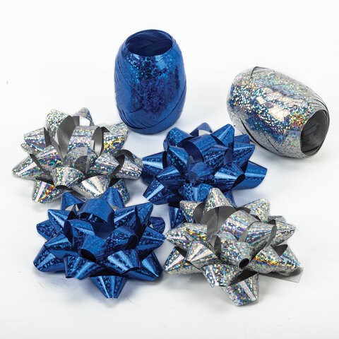 Набор состоит из 2-х лент шириной 5 мм и длиной 10 м каждая, а также из 4-х бантов-звезд диаметром 7,5 см. Товар представлен в 2-х цветах с голографическим эффектом: синем и серебристом. Ленты и банты выполнены из прочного полипропилена (70%), полиэтилена (15%) и полиэтилентерефталата (15%). Банты являются самоклеящимися. Для того, чтобы прикрепить бантик, необходимо отклеить стикер с обратной стороны банта по линии перфорации и плотно прижать бант к поверхности. Набор упакован в ПВХ-коробку.