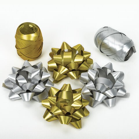 Набор состоит из 2-х лент шириной 5 мм и длиной 10 м каждая, а также из 4-х бантов-звезд диаметром 7,5 см. Товар представлен в 2-х цветах голографическим эффектом: золотистом и серебристом. Ленты и банты выполнены из прочного полипропилена (70%) и полиэтилена (15%) и полиэтилентерефталата (15%). Банты являются самоклеящимися. Для того, чтобы прикрепить бантик, необходимо отклеить стикер с обратной стороны банта по линии перфорации и плотно прижать бант к поверхности. Набор упакован в ПВХ-коробку.