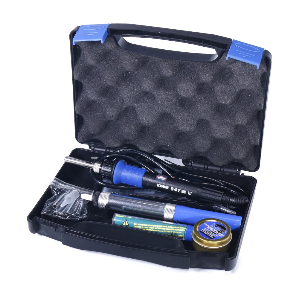 Element 947-IIIстанет одним из самых востребованных наборов инструментов Вашего домашнего оснащения, ведь именно при помощи паяльника можно осуществить пайку и распайку самых различных материалов, будь то блок питания, микросхема или система электропроводки, то есть, всего того, что нас окружает в повседневной жизни. При этом сопутствующие элементы в виде оловотсоса, пинцета и очистителя позволят производить паяльные работы в полной мере и без необходимости докупать эти инструменты отдельно. Эргономичный дизайн рукояти паяльника, которая противостоит нагреву и обладает удобным хватом предполагает так же размещение функциональной детали инструмента - регулятора температур, благодаря которому легко и быстро можно задать оптимальный нагрев жала в соответствии с видом производимых работ.