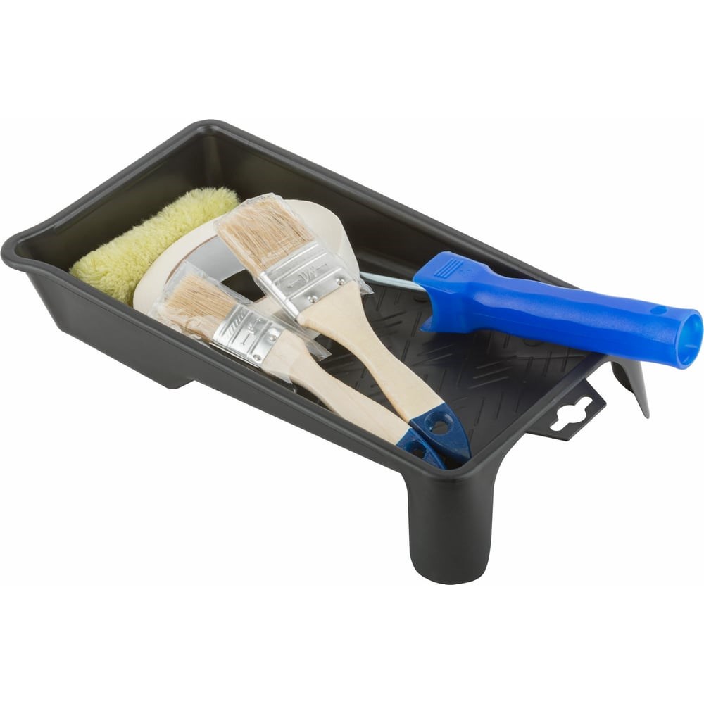 Набор для покраски дверей и окон: ванночка, валик, лента, 2 кисти FIT РОС 03035 предназначен для разведения и нанесения краски на обрабатываемую поверхность. Оснащен пластиковой ванночкой для разбавления краски. Полиакриловый валик с пластиковой рукояткой используется для нанесения на большую площадь рабочего материала. Две кисти небольшого размера для нанесения различного вида красок, на различного рода поверхности. Малярная лента служит для заклеивания нежелательных для покраски мест, что позволяет аккуратно выполнять работу. Внимание! Фотография носит иллюстративный характер, реальный товар может отличаться от представленного на изображении.